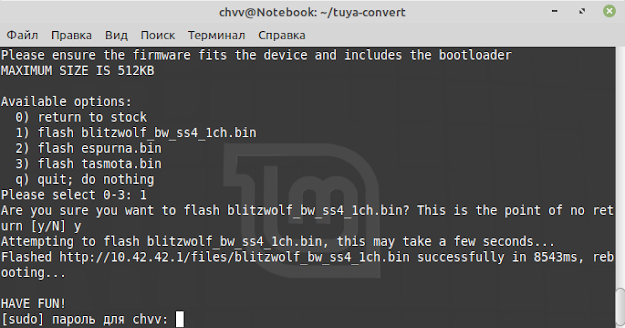 18) Бекап оригинальной прошивки BlitzWolf BW-SS4 1ch автоматически был сохранен на ноутбуке в папку с текущей датой_временем, которая расположена в папке «backup» находящейся в «tuya-convert» домашней папки текущего пользователя (home/ИМЯ ПОЛЬЗОВАТЕЛЯ/tuya-convert/backup):