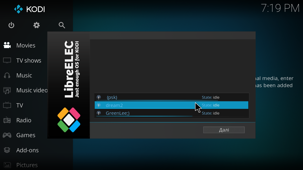 3) После окончания записи вставляем SD-карточку в приставку и включаем ее с зажатой кнопкой внутри кнопкой внутри AV-разъема. Произойдет загрузка LibreELEC из карточки. Далее нужно выбрать язык системы. Нажимаем на надпись «English»: